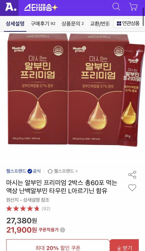 [옥션] 마시는 알부민 프리미엄 20g 30포 2박스 60포 (21,900원/무료) > 국내핫딜