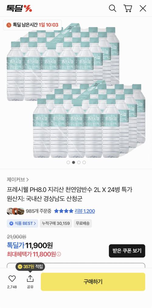 [카카오] 프레시웰 PH8.0 지리산 천연암반수 2L × 24병 (11,800원/무료)