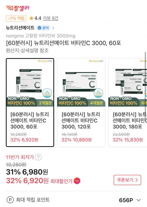 [11번가] 뉴트리션메이트 비타민C 3000 60포 (6,980원/무료)