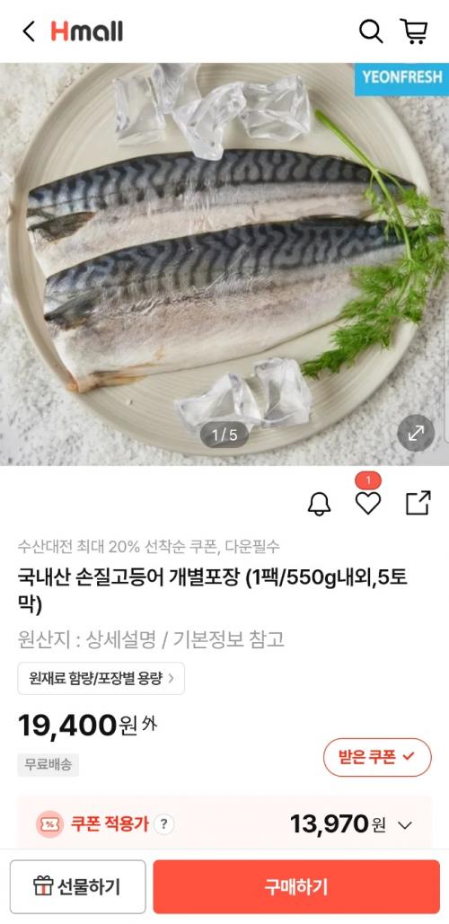 [hmall] 국내산 손질고등어 2팩 총 10토막 (13,970원/무배) > 국내핫딜