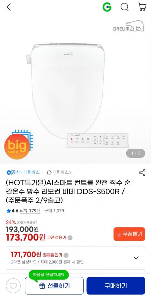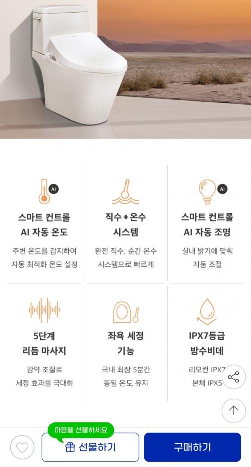[지마켓] AI스마트 컨트롤 완전 직수 순간온수 방수 리모컨 비데 (173,700원 / 무료배송) > 국내핫딜