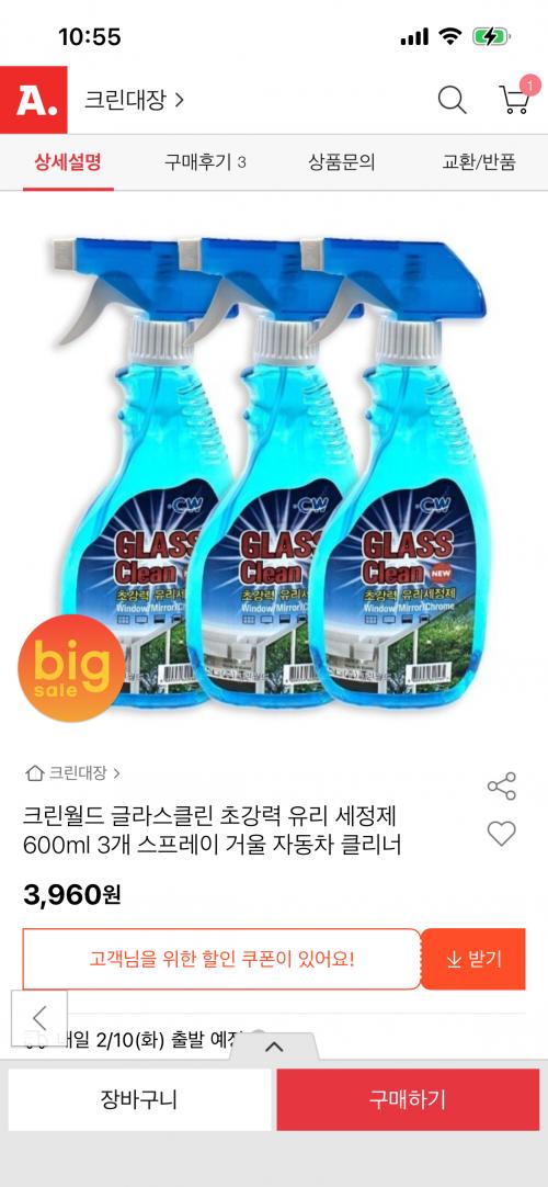 [옥션] 크린월드 글라스클린 초강력 유리 세정제 600ml 3개 (3,960원/3,000원) > 국내핫딜