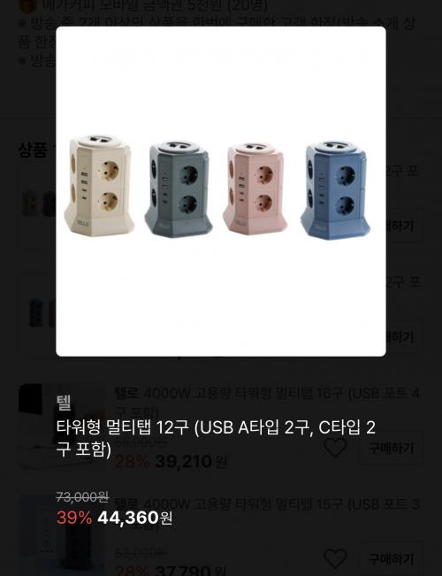 [지마켓] 텔로 타워 컬러 멀티탭USB 12구(44,360원/무배)
