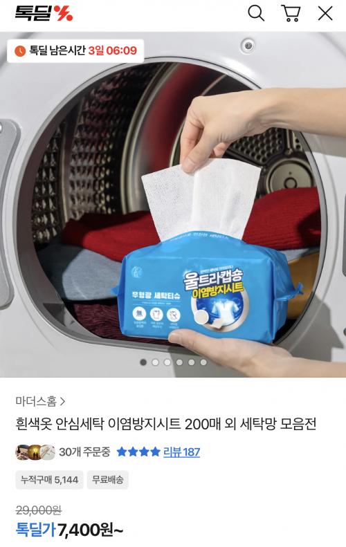 [톡딜] 흰색옷 안심세탁 이염방지시트 200매 (7,400원/무료)