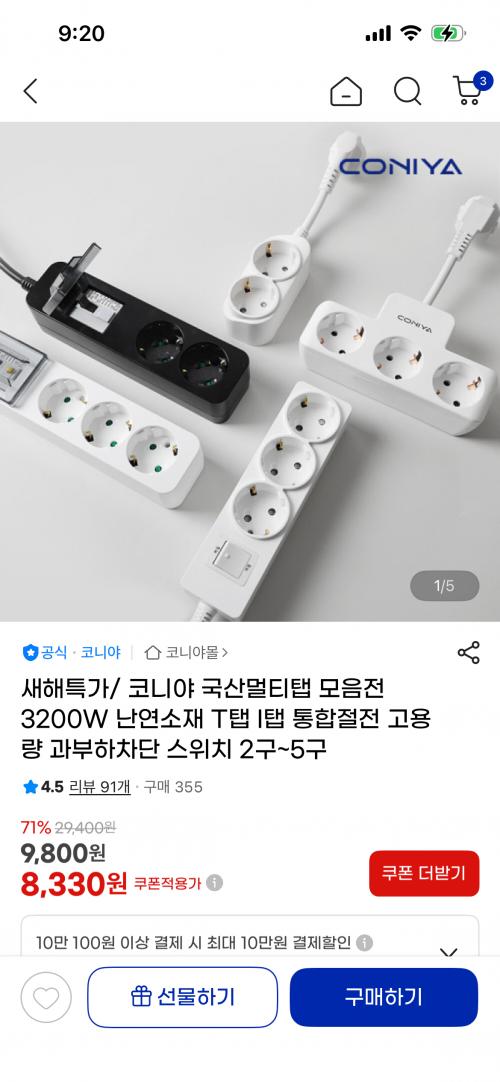 [G마켓]국산멀티탭 3200W 난연소재 T탭 I탭 통합절전 고용량 2구~5구 (8,330원~/무료) > 국내핫딜