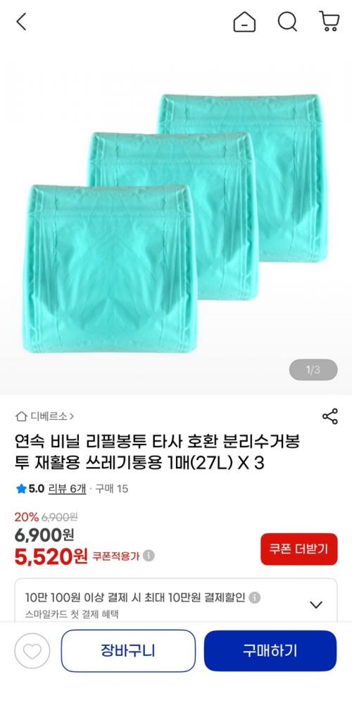 [지마켓] 27L 타사호환 분리수거 쓰레기 연속 리필봉투 3개 (5,520원/무배) > 국내핫딜