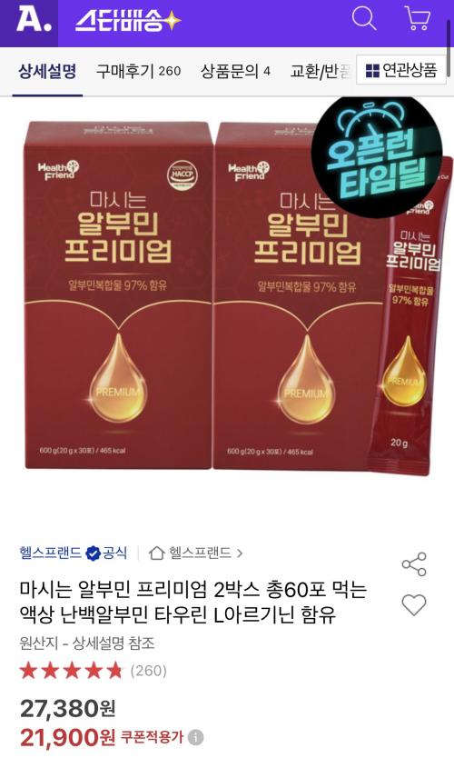 [옥션] 마시는 알부민 프리미엄 20g x 30포 2박스 (21,900원/무료) > 국내핫딜