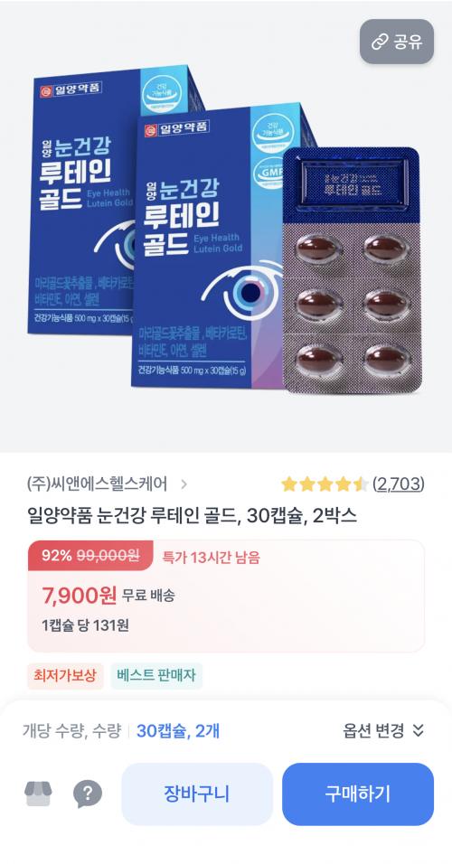 [토스쇼핑] 일양약품 눈건강 루테인 골드 30캡슐 2박스 (7,900원/무료)