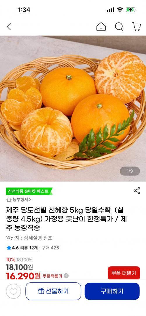[지마켓] 제주 당도선별 천혜향 5kg 당일수확 (실중량 4.5kg) (16,290원/무료) > 국내핫딜