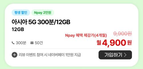 5G 요금제로 음성 300분 / 데이터 12GB 로 평생 9,900원 입니다.