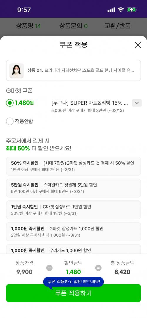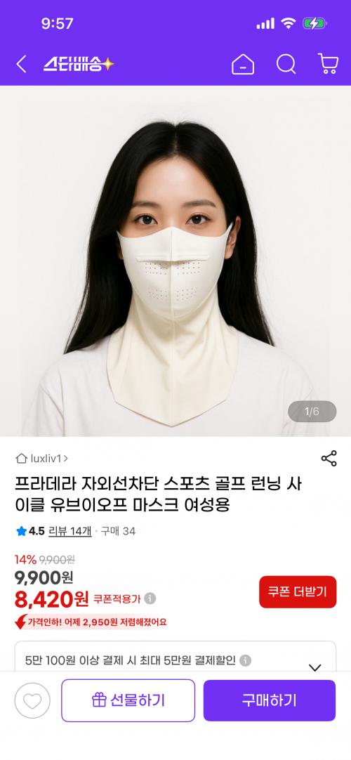 [지마켓] 자외선차단 스포츠 마스크 (8,420원/무료)