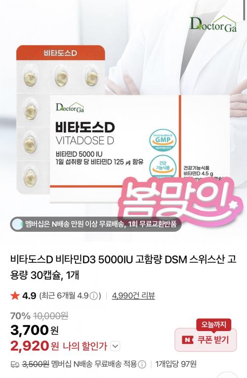 [네이버] 비타도스D 비타민D3 30캡슐( 2,920원 /네멤무료) > 국내핫딜