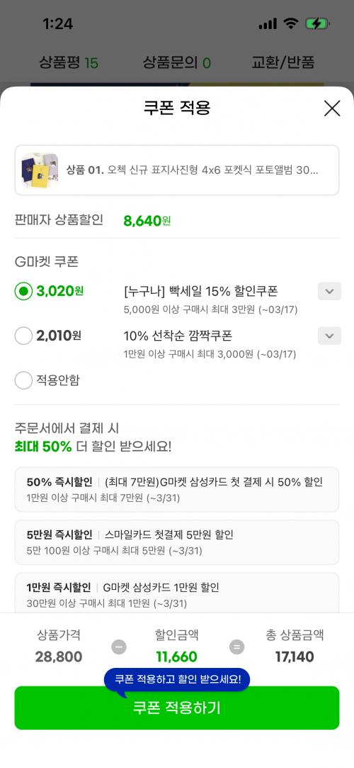 [지마켓] 표지사진형 4x6 포켓식 포토앨범 300장 보관 가능 (17,140원/무료)