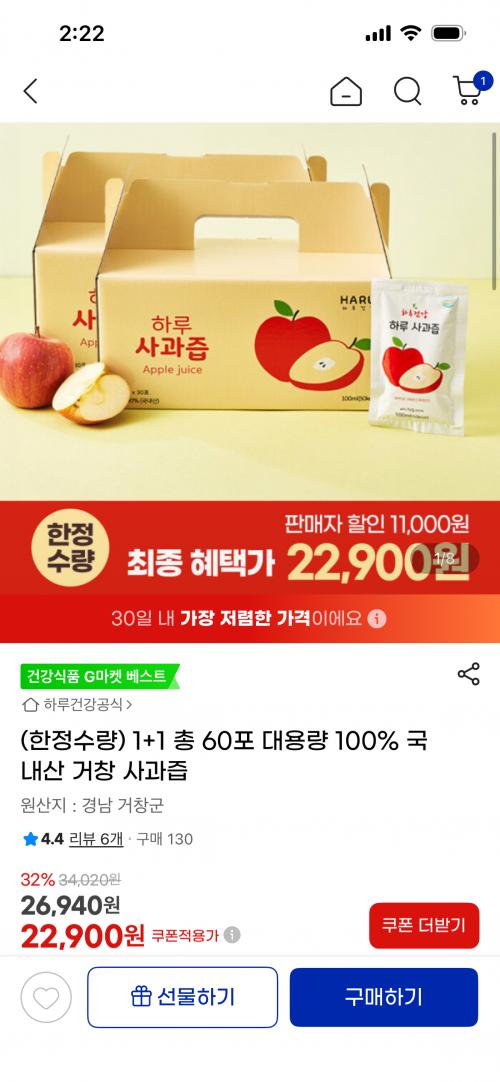 [지마켓] 100% 국내산 거창 사과즙 60포 대용량 (22,900원/무료) > 국내핫딜