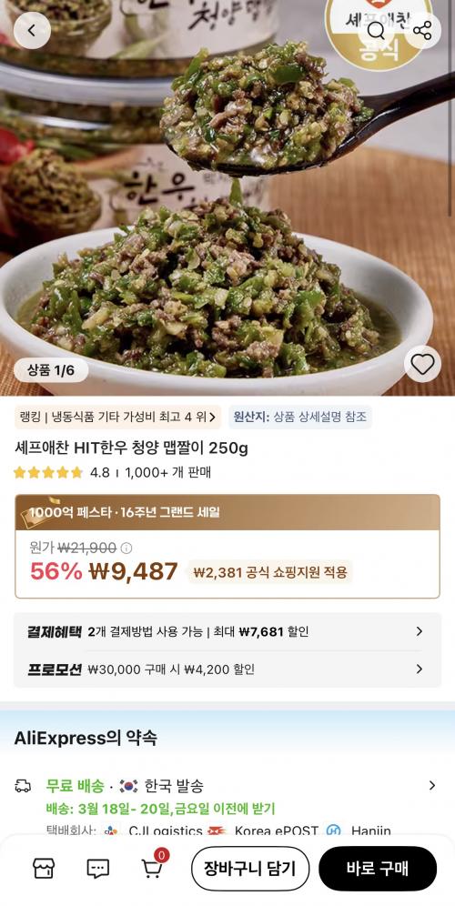 [알리] 한우맵짤이 250g (9,487원/무배) > 국내핫딜