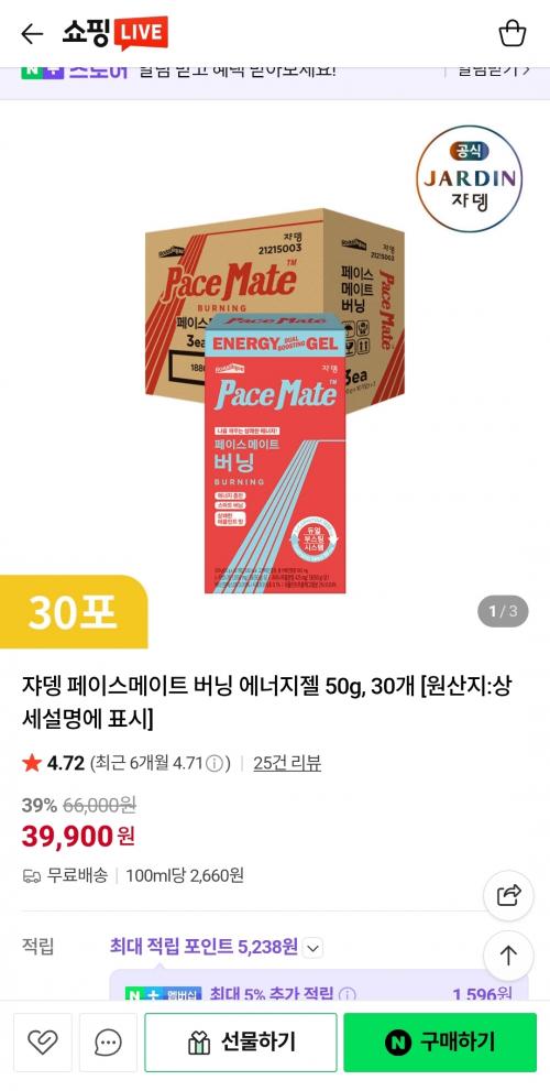 쟈뎅 페이스메이트 버닝 에너지젤 50g, 30개 : https://product.shoppinglive.naver.com/products/5814820679