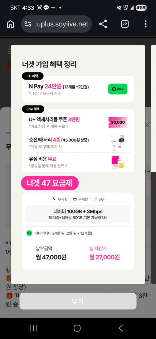데이터 100g+3mb 무제한인데 12개월 Npay 2만씩 받는거 생각하면 월 27,000원인셈이에요.