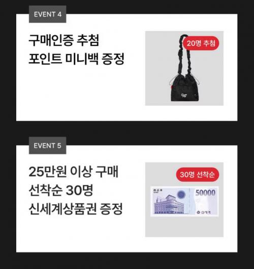 사은품이 좋은데 구매전원 모자 증정에 인증추첨 20명 미니백/25만원이상 구매 선착30명 신세계상품권 5만원권 증정있네요