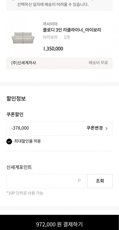 [신세계까사] 까사미아 신상 3인 리클라이너 출시 혜택 (972,000원/무배) > 국내핫딜