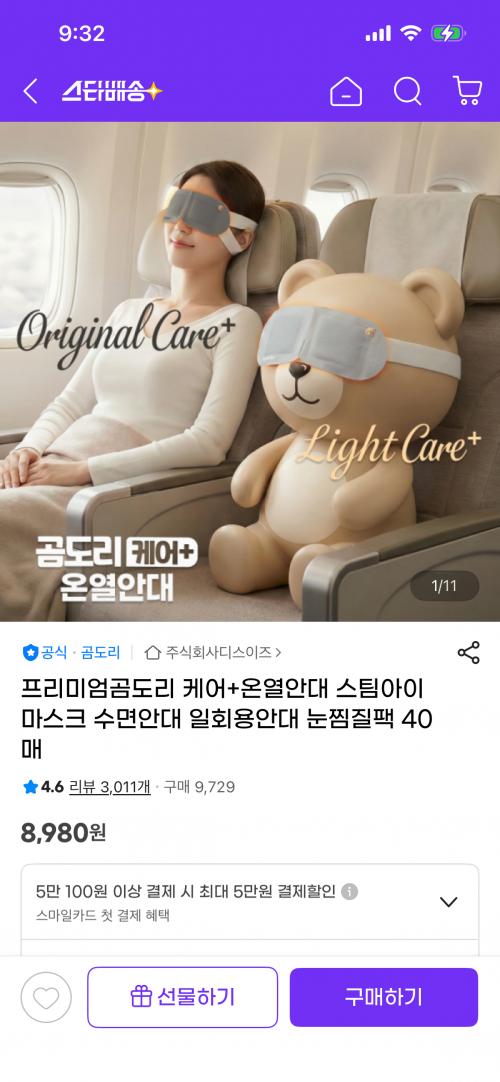 [지마켓] 곰도리 케어+온열안대 스팀아이마스크 40매 (8,980원/무료)