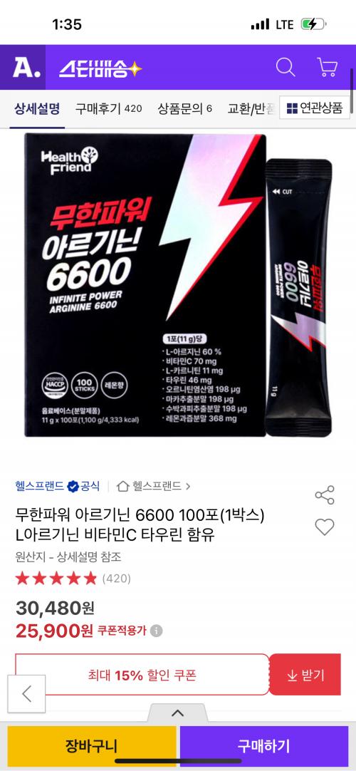 1포에 아르기닌 함량 6,600 mg 든거라 고함량이고
