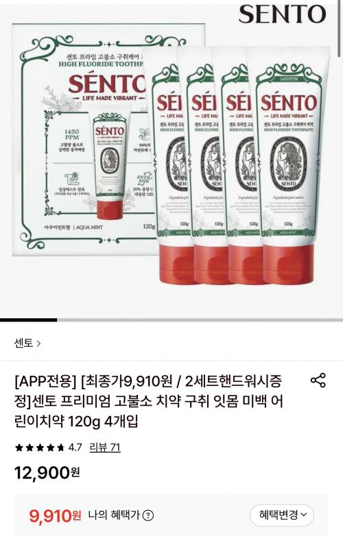[롯데온]센토 고불소 치약 구취 잇몸 미백 어린이치약 120g 4개(9,910원/무료) > 국내핫딜
