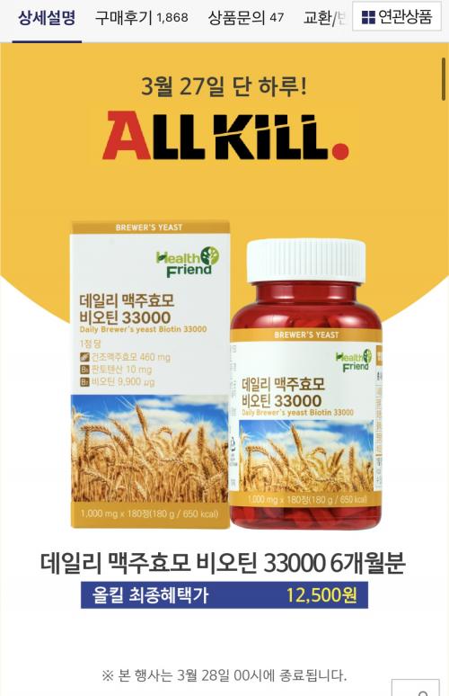 [옥션] 탈모 맥주효모 비오틴 33000 6개월분 180정 (12,500원/무료)