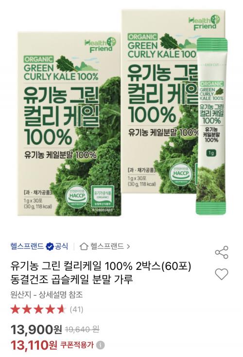 유기농 케일분말 100%짜리 60포에 할인가 13,110원 입니다