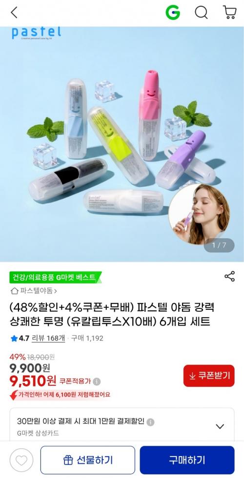 [지마켓] 파스텔 야돔 투명 6개입 세트 (9,510원 / 무료배송) > 국내핫딜