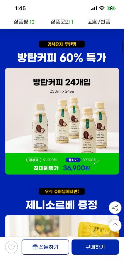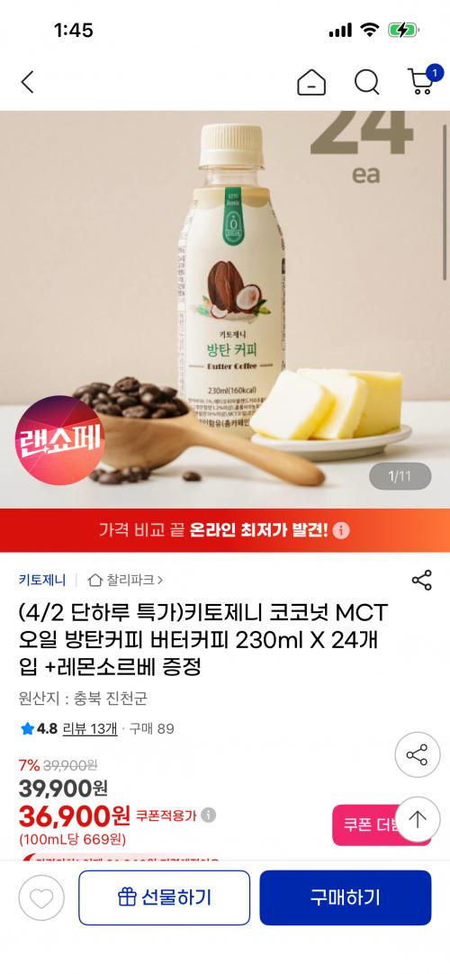 [지마켓] 키토제니 코코넛 MCT 오일 방탄커피 버터커피 230ml X 24개입 +레몬소르베 증정 (36,900원/무료) > 국내핫딜