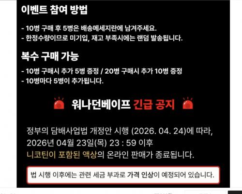 4월말쯤에 니코틴 액상에 세금붙고 온라인 구매도 안된다고 하네요. 가격 오르기전에 구매하심 될듯..