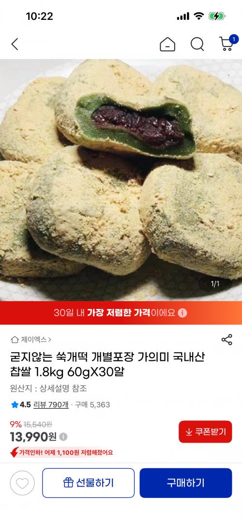 [지마켓] 굳지않는 쑥개떡 1.8kg 60gX30알 (13,990원/무배) > 국내핫딜
