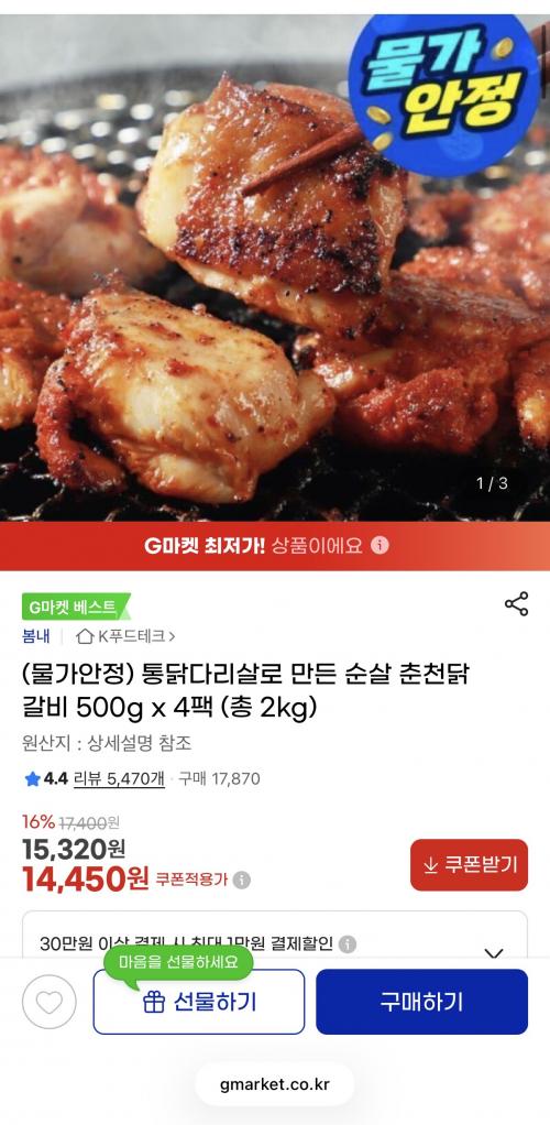 [지마켓] 통닭다리살로 만든 순살 춘천닭갈비 500g x 4팩 14,450/무배 > 국내핫딜