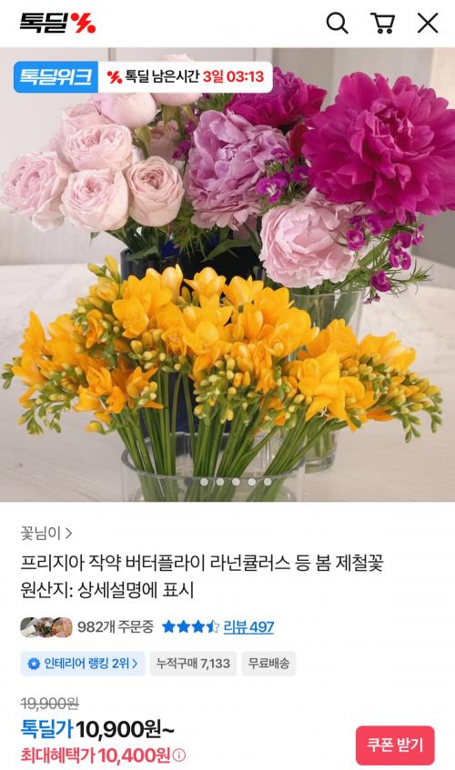 [카카오] 프리지아 30송이,작약반단 (9,900원/무료) > 국내핫딜