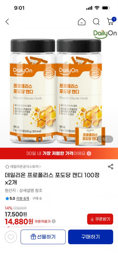 [지마켓] 데일리온 프로폴리스 포도당 캔디 100정x2개 (14,880원/무료)