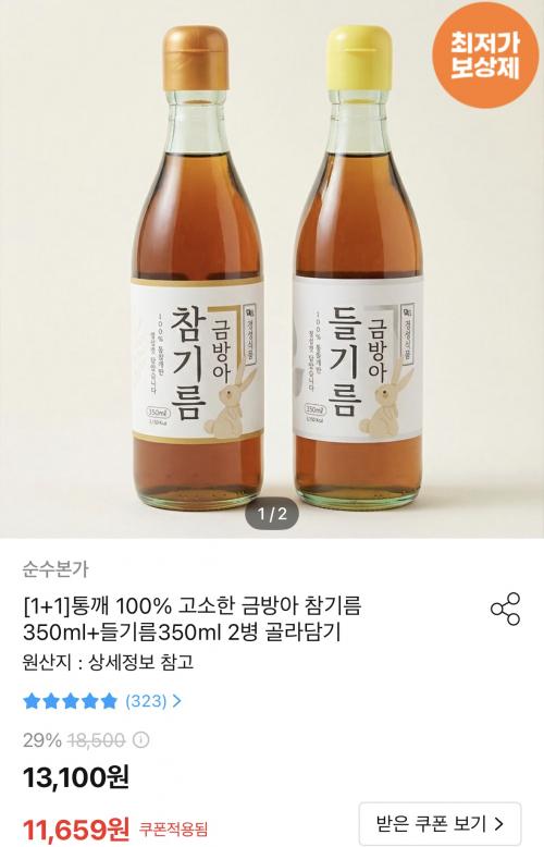[오늘의집] 통깨 100% 고소한 금방아 참기름350ml+들기름350ml 2병 (11,659원/무료) > 국내핫딜