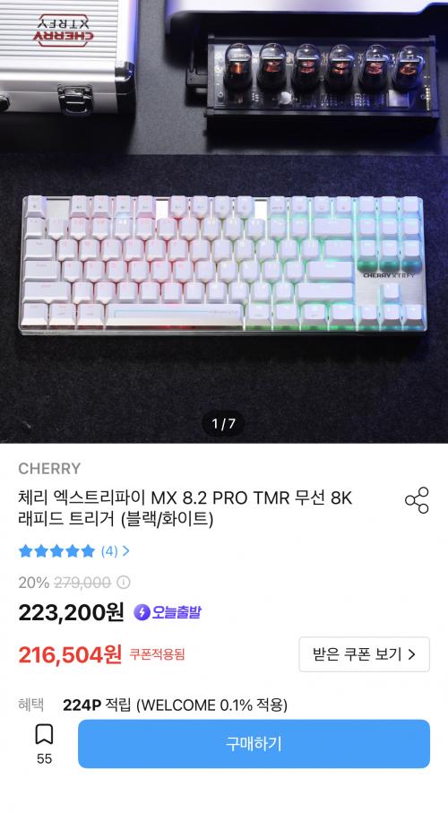 [오늘의집] CHERRY 엑스트리파이 MX 8.2 PRO TMR 무선 8K 래피드 트리거 블랙/화이트 (210,304원/무료)