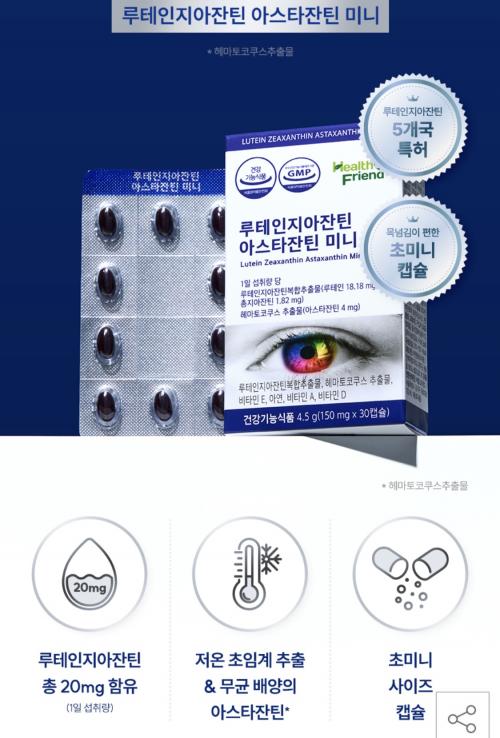 한캡슐 루테인 18.18mg + 지아잔틴 1.82mg + 아스타잔틴 4mg 든거라 1일 섭취량 충족 함량 좋습니다