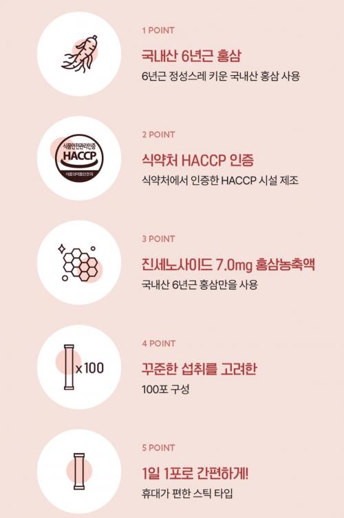 국내산 6년근 홍삼을 사용했고 진세노사이드 7mg 홍삼농축액이 들어가 있어서 성분도 좋은데 가격도 저렴한 편이라 데일리로 챙기기 좋아요!