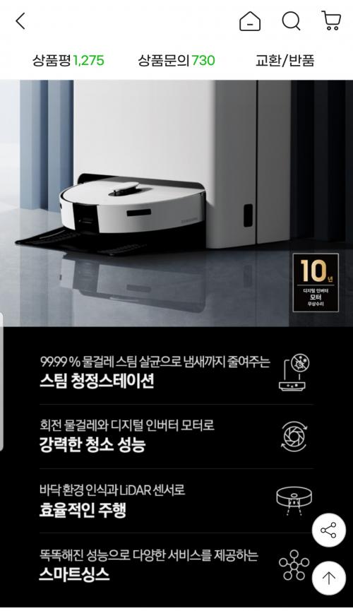스팀 살균 스테이션으로 따로 물걸레 빨거나 세정제도 필요 없어서 경제적인 로봇청소기입니다