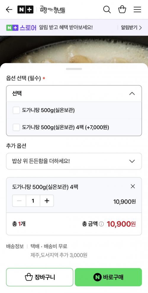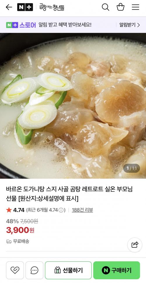[네이버] 스지 사골 도가니탕 500g 4팩 (10,900원/무료)