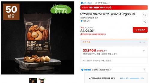 [지마켓] 블렌드 하루견과 22gx50봉 (34,940원/무료) > 국내핫딜