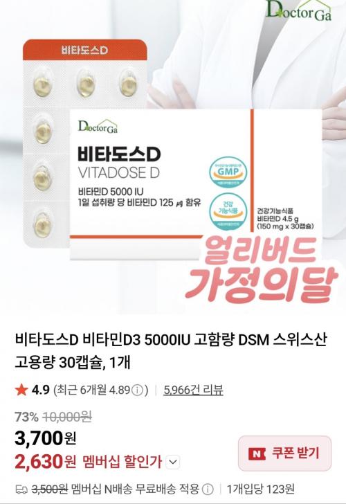 [네이버] 비타도스D 비타민D3 5000IU 고함량 30캡슐 1개 (2,630원/네멤무료) > 국내핫딜