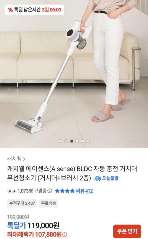 [톡딜] 캐치웰 에이센스 BLDC 자동 충전 거치대 무선청소기 거치대+브러시 2종 (107,880원/무료) > 국내핫딜