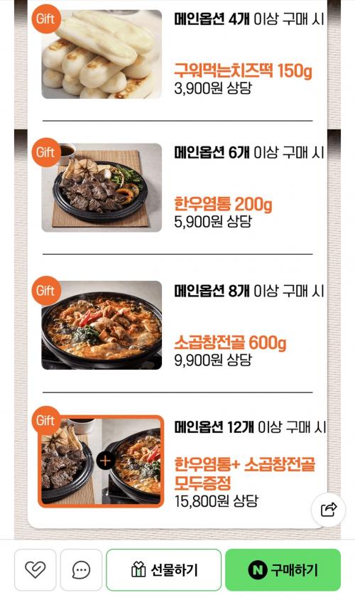구매 수량별 사은품 4개 치즈떡, 6개 염통, 8개 소곱창전골 있네요