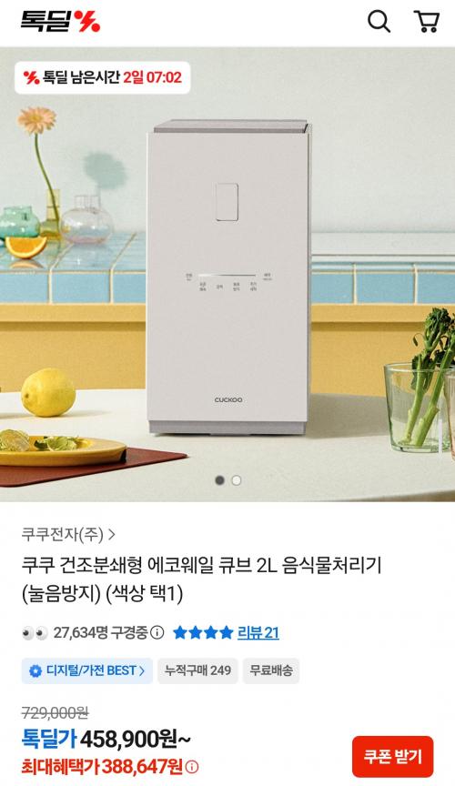 쿠쿠 톡딜가로 건조분쇄형 음처기 저렴하네요