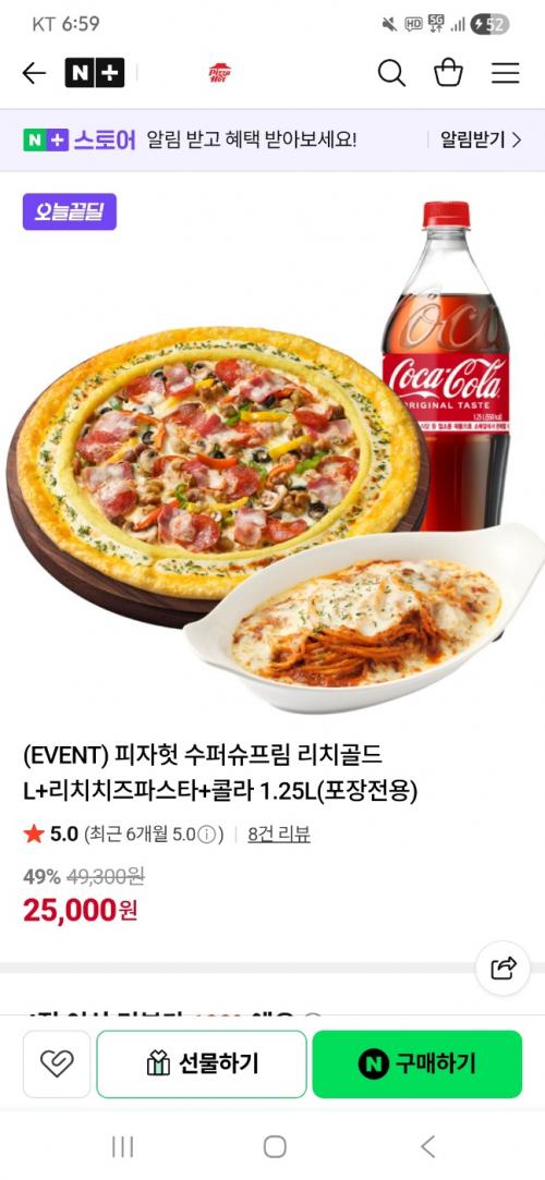 [네이버] 피자헛 수퍼슈프림 리치골드 L+리치치즈파스타+콜라 1.25L(포장전용) (25,000원/무료)