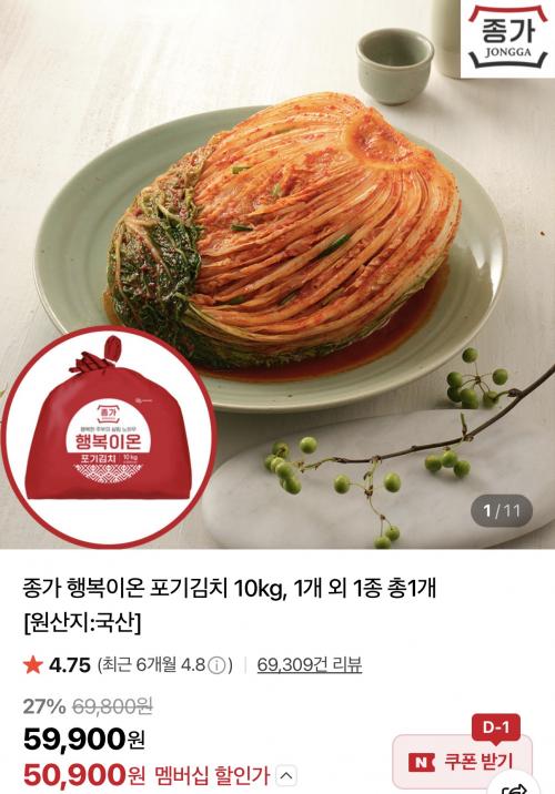 [네이버] 종가 행복이온 포기김치 10kg (50,900원/무료)