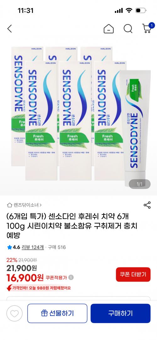 [지마켓] 센소다인 후레쉬 치약100g 6개 (16,900원/무료) > 국내핫딜