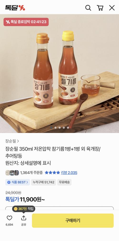 [카카오] 장순필 350ml 저온압착 참기름/들기름 특가 (11,900원/무료)